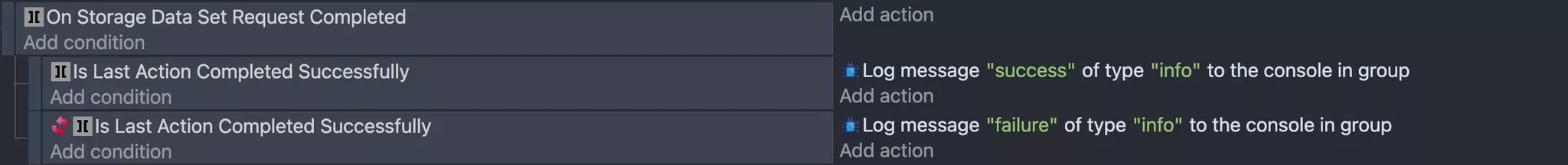 Optionally, you can perform additional actions once the saving process is completed. To achieve this, use the On Storage Data Set Request Completed condition. Additionally, if you need to verify whether the save operation was successful, you can use the Is Last Action Completed Successfully condition. Based on the result of this check, you can trigger appropriate actions to handle both success and failure scenarios effectively.