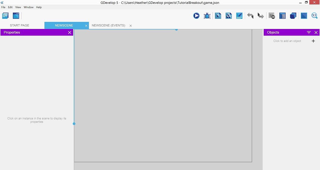 Scenes contain objects displayed on screen as game content. Each object you place on a scene is called an instance. Your breakout game will have several instances of the brick object on a game level scene. Scenes also contain events - actions that happen under specific conditions - to animate the scene.
